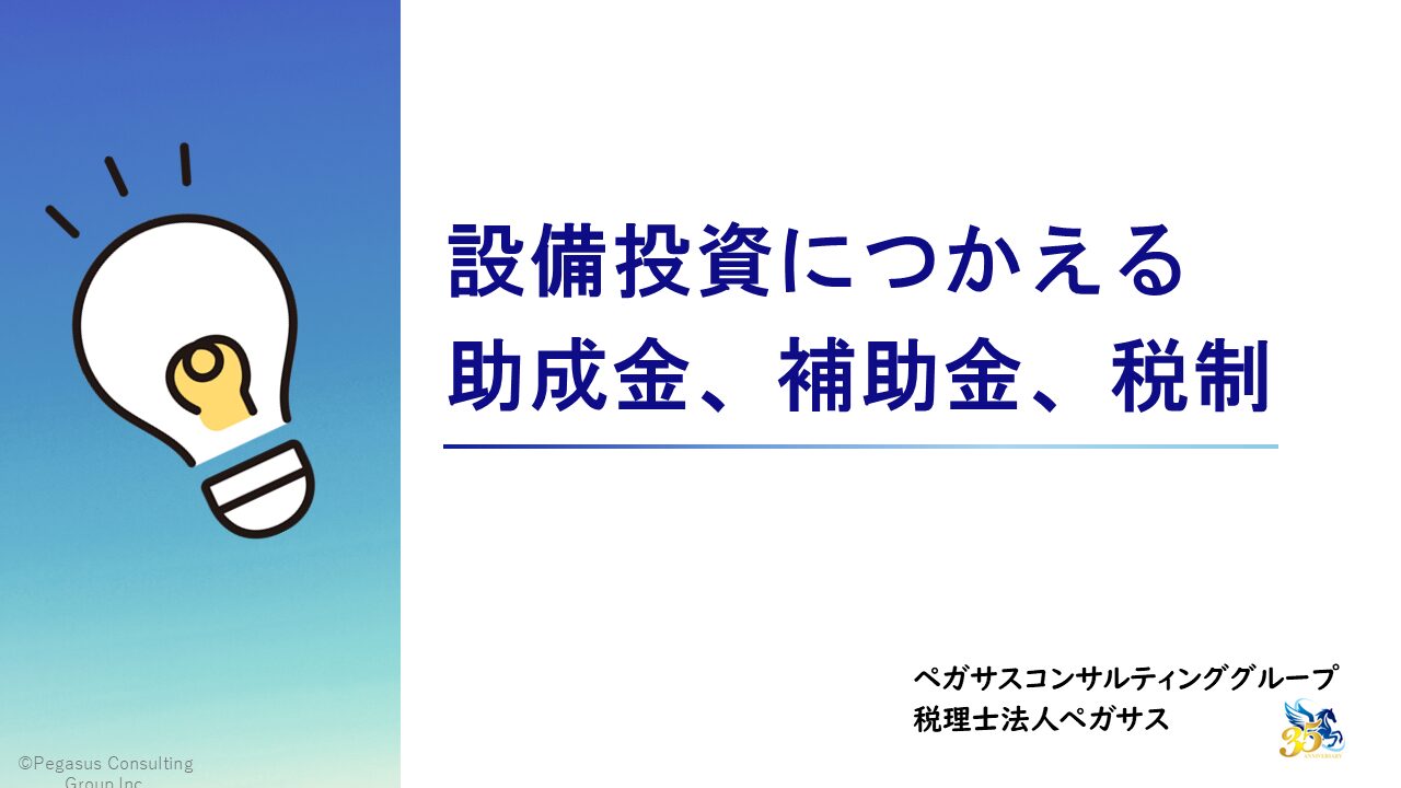お客様から様々な設備投資に使える助成金や補助金はありませんか?という質問をいただきます。 税理士法人のお客様だけでなく、グループ内の他のお客様からもそのようなご質問をいただきます。 それならば!と皆が使える提案資料を作ろうという流れになり作成したものをここで少しお披露目します。 ↓リンクからご覧ください。 「設備投資パッケージ」助成金でも補助金でも設備投資に使えるものはありますが、利用用途が限られます。 補助金に至ってはその種類自体も多数ありご紹介するだけでもかなり多くなってしまいます。 この提案資料ではその中でもよく使われるものなど抜粋してご紹介しています。 また助成金・補助金以外にも税制の適用ができるものがあります。 これは法人税の控除や特別償却と言われる特殊な減価償却が認められているものです。 意外と知らない方もいらっしゃいますので、設備投資を検討する際には、必要となる時期と その時期までにこれらの制度活用が可能かを合わせて検討しましょう!